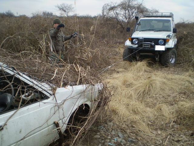 昼食後、小高い崖の草むらに埋もれた軽四駆をウインチで引き出し