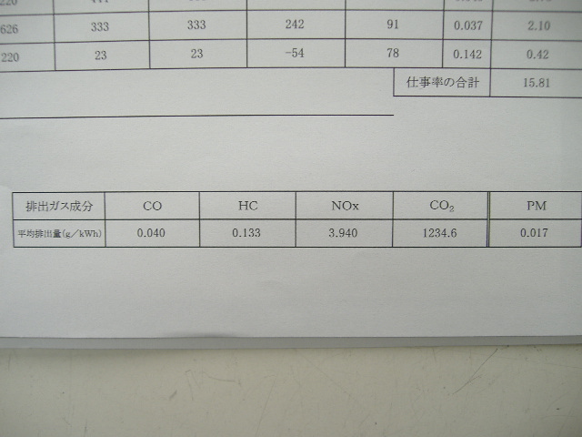 試験結果ですが、NOxが基準値5.9g/kWh未満のところ3.940で、
