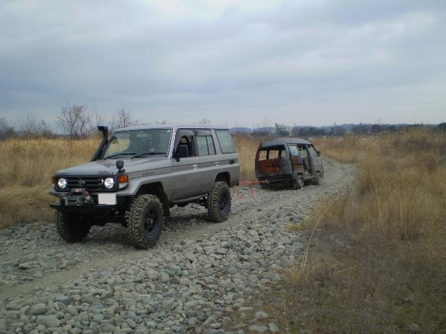 昼食後、小高い崖の草むらに埋もれた軽四駆をウインチで引き出し